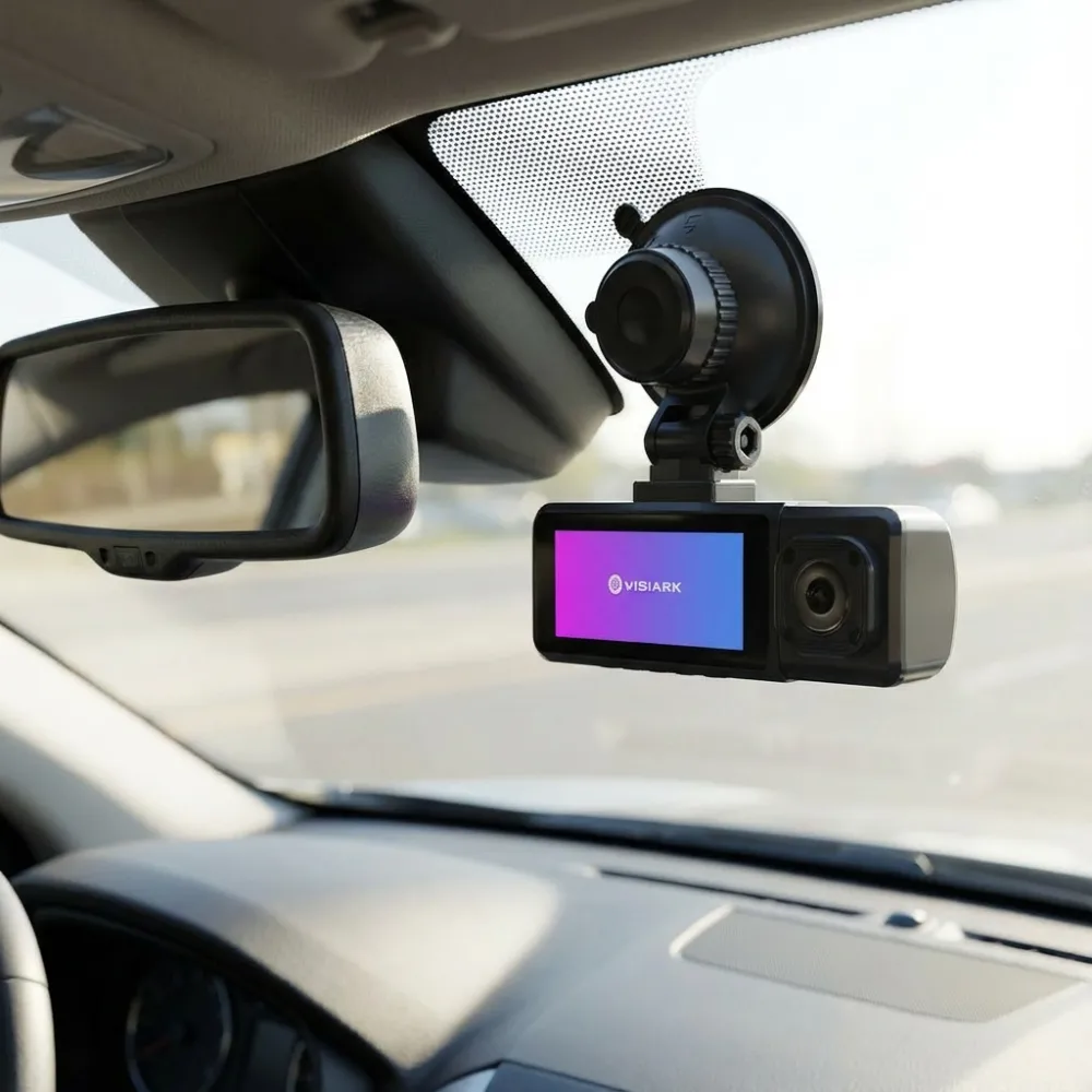 Secure your Visiark dash cam to the windshield with the included mount. Angle it for a clear, wide view of the road.